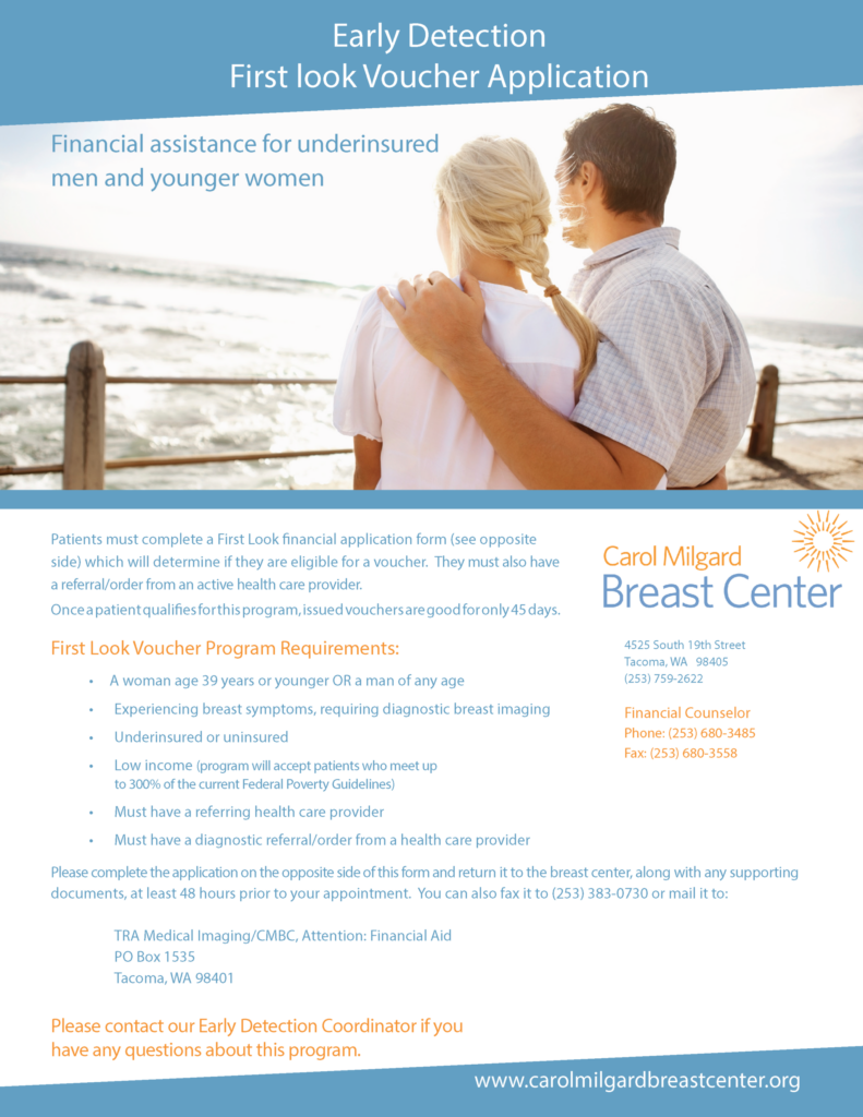 If you think you might be eligible for financial assistance, fill out the Financial Aid Application and return it to the breast center, along with any supporting documents, at least 48 hours prior to your appointment. Please note that the entire application must be filled out. An incomplete application will result in the delay of eligibility. You can also fax it to (253) 680-3558 or mail it to: