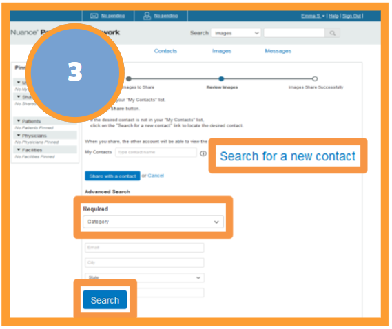 3. To find a recipient, click Search for a new contact and use the Advanced Search options to search for a Patient. Click Search.